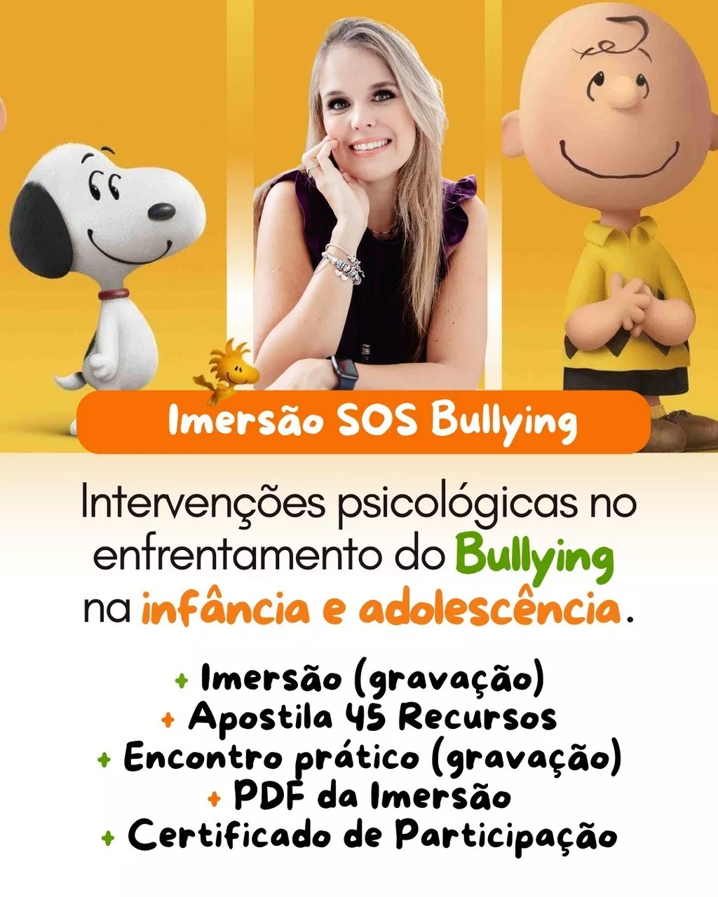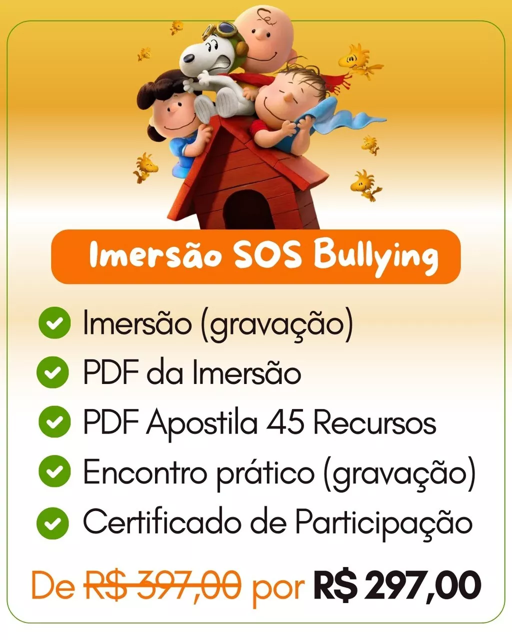 Na Imersão SOS Bullying, vou compartilhar com você as mesmas estratégias e recursos que aplico todos os dias na clínica, nas escolas e em projetos, para que você saia preparado(a) para agir de forma prática e eficaz.
