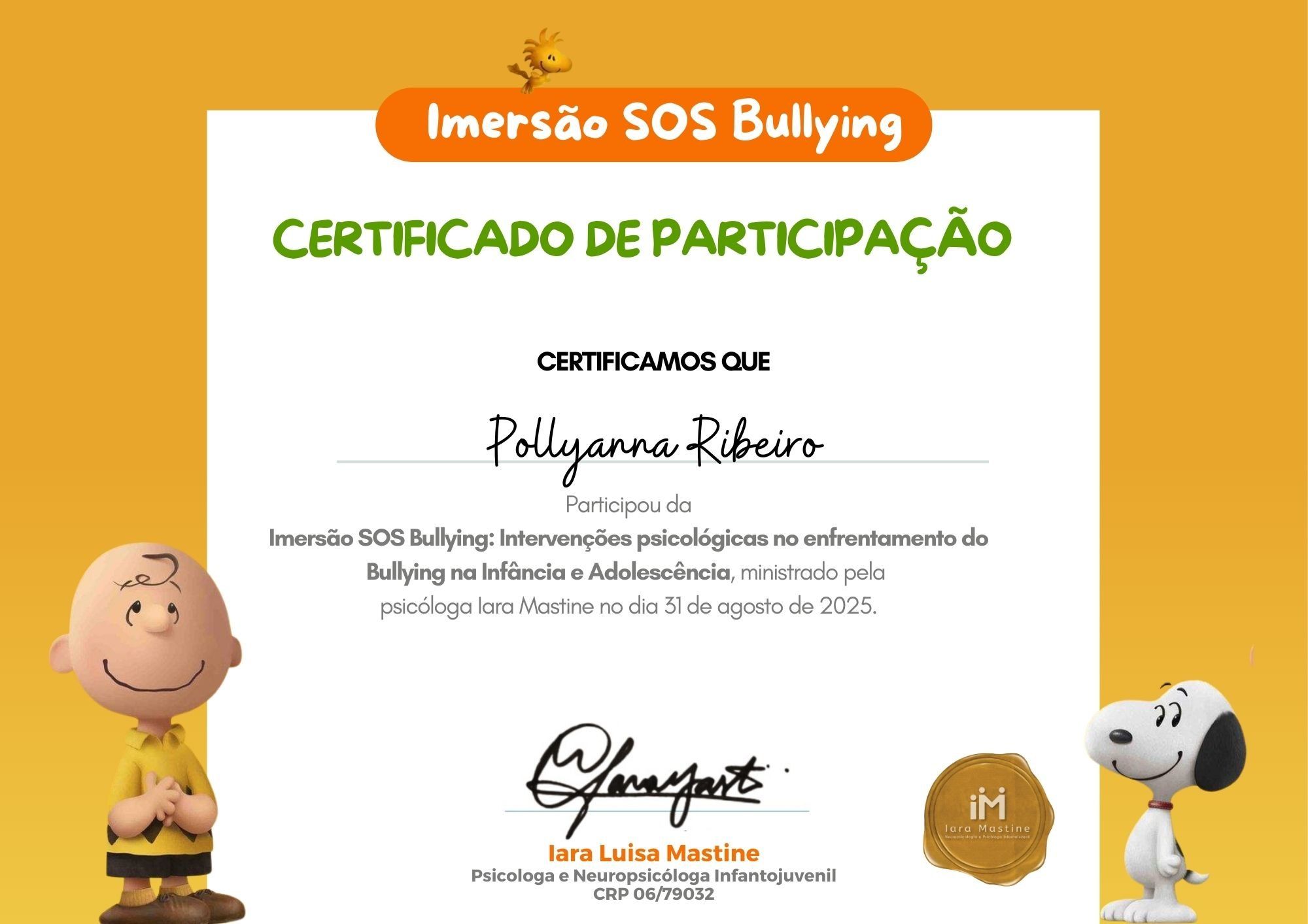 Certificado de participação para enriquecer seu portfólio e demonstrar seu compromisso em oferecer intervenções seguras, criativas e eficazes contra o bullying.
